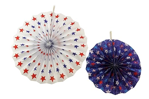 Package contains 1 large white fan (14" diameter) and 1 Medium Blue Fan (10" diameter) Great for decorating for Memorial Day, 4th of July or Veterans Day Fans have star decorations imprinted on them Comes with attachment at the top so that they may be hung from ceilings, trees, railings, etc.