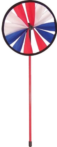 In The Breeze item #2833 - 8 inch Single Wheel Patriot Spinner is made with red white and blue colored durable polyester fabric that is stain, UV and weather resistant. The size is 8 inches wide by 21 inches high. It comes with a fiberglass pole. Minimal assembly is required -simply put the assembled wheel on the horizontal rod-then secure with rubber end cap. In high wind areas we recommend using a high-strength glue to secure the end cap - glue is not included. This will prevent the petal wheel from being pushed off from excessive wind coming from the back. Spinners can be hand held or for the garden. Kids love pinwheels and spinners. Use them for party favors, bridal and baby showers, wedding receptions, gift baskets, holidays, flower pots and for wind direction.