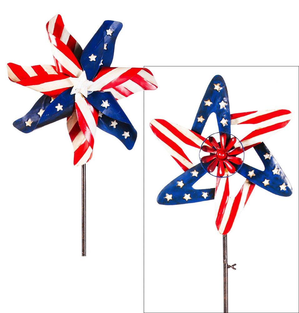THE SPECIFICS: The set of 2 double pinwheel garden stakes measures 13.25" x 34.75" in a red, white and blue--stars and stripes design. EMBRACE YOUR PATRIOTISM: This patriotic pinwheel garden stake is perfect for the upcoming election, 4th of July, President's Day, Veteran's Day, birthday parties, and more. DURABILITY: The easy-to-assemble spinners and pole are sturdy making it stable in the out-of-doors. COLORFUL DESIGN: This double pinwheel will get some attention when the wind blows both pinwheels, showing off its bright stars and stripes design. It will look beautiful in your garden or on your patio. GREAT GIFT: A perfect gift for yourself, family and friends for the any celebration, but especially those with a patriotic or red, white, and blue color theme.