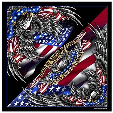 Patriotic Upwing Bandana measures 21"x21". Upwing eagle with american flag design on both sides.