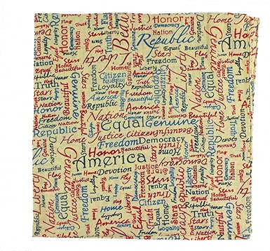 PATRIOTIC BANDANA. 100 % COTTON. MACHINE WASHABLE. MEASURES 22" X 22".