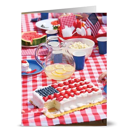 Patriotic design featuring sweet summer treats. Cards have a high quality glossy exterior and are blank inside. Envelopes are included.