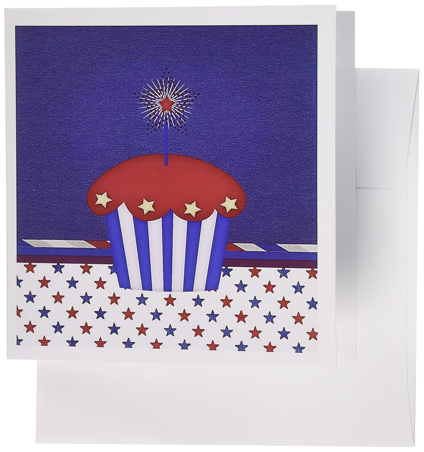 Set of 12 Greeting Cards, Patriotic Cupcake with Star Sparkler in Red, White and Blue
