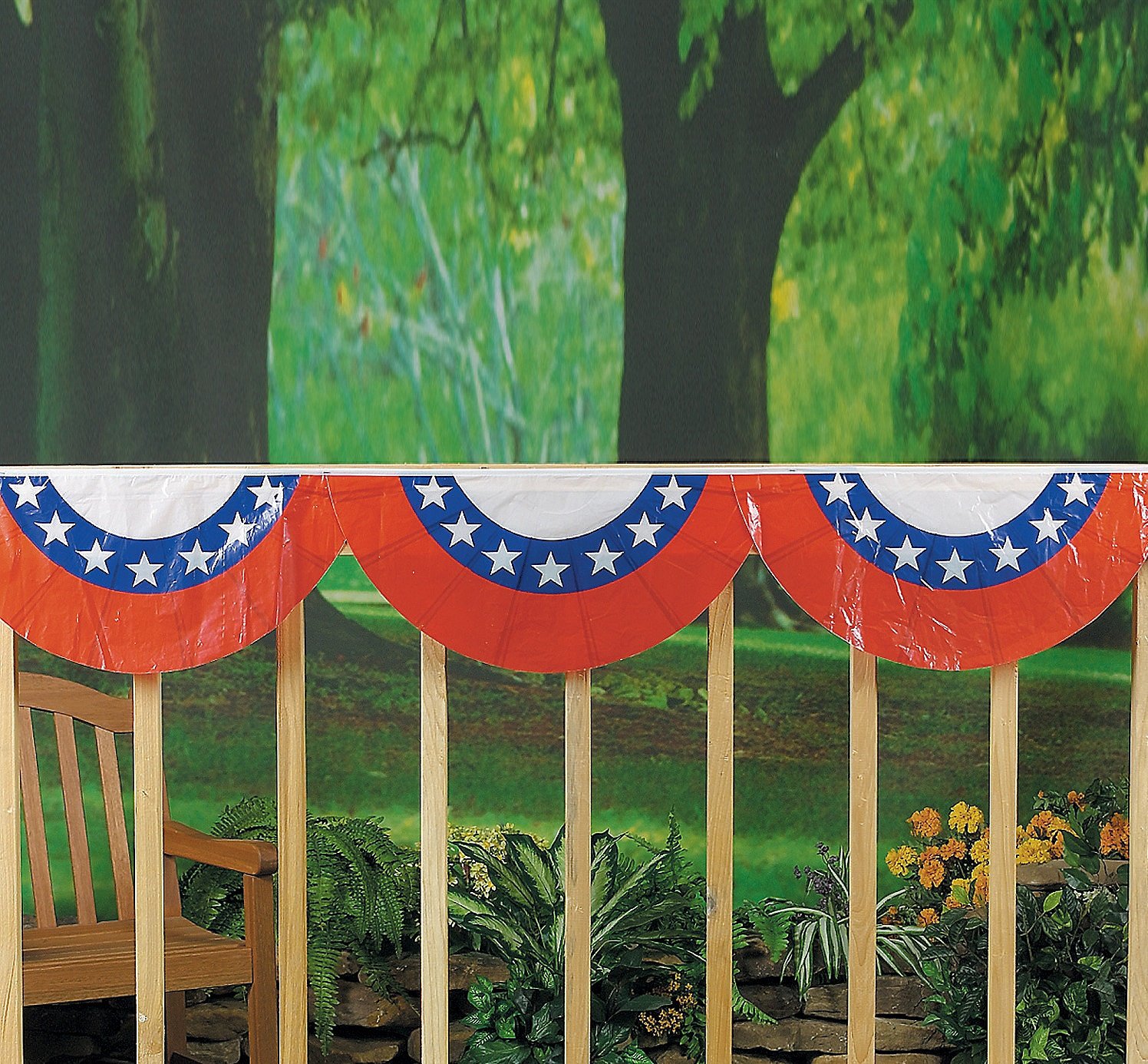 This 11' long Patriotic Bunting Garland is made of a lightweight, weather-proof plastic. Garland has ties on either end for easy installation. The 4 circular sections measure approximately 16" wide x 32" long. Makes a great porch or fence banner! For indoor or outdoor use.