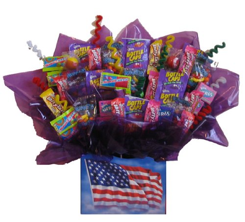 Looking for a memorable gift? This Tart & Taffy Candy Bouquet in a Patriotic gift box is arranged in a colorful gift basket box featuring an excellent assortment of sweets that will thrill any lucky recipient! Send your best wishes in a fun style with this party in a box! Such a Delicious and Fun Gift! This colorful candy bouquet makes an excellent gift and is filled with at least 24 delicious pieces of tart and tasty candies. Tart and Taffy candies include Sweet Tarts, Bottle Caps, Runts, various flavors of Laffy Taffy, and Nerds. We may substitute comparable candies if necessary. Candy Bouquet measures approximately 15in wide by 6in deep by 17in tall.