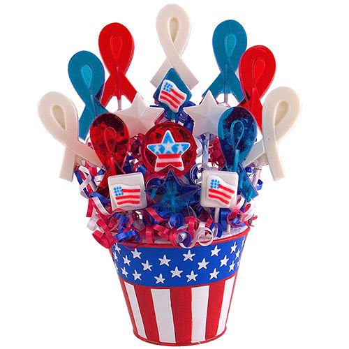 Having a Memorial weekend BBQ,4th of July event or military retirement? This candy arrangement will make a perfect edible centerpiece with its patriotic colored lollipops! Comes with red, white, or blue chocolate candies to fill the bucket, yum!