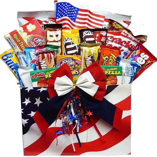 Show your patriotic colors in vibrant red, white and blue with this great collection of snacking food and candy treats presented in an American flag gift box. It's the perfect way to celebrate the Fourth, honor a service member or send you're Welcome Home, Thank You or Good Luck message in true American style! Featuring all their favorite snack foods from Chips, Toffee Popcorn Snacks, Cookies, Candy, and more all in an American Flag, Patriotic Themed Box.