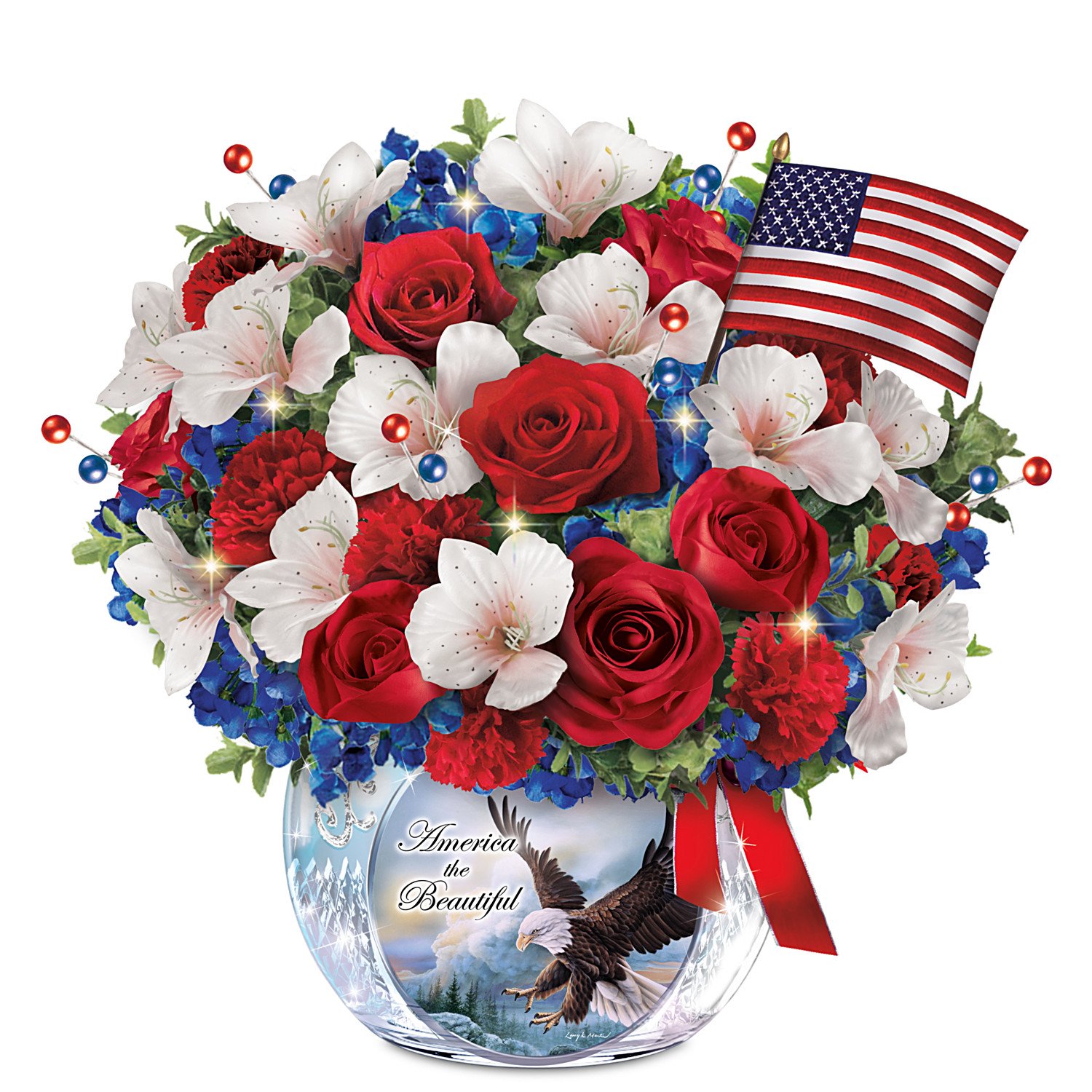 Red, white and blue is a color combination that is always in season. Now, an Always in Bloom® patriotic centerpiece lets the beauty and symbolism of our nation's colors flourish in your home. Featuring a silken red, white and blue floral arrangement, the America the Beautiful Table Centerpiece glows with patriotic pride and an abundance of long-lasting LED lights. It showcases artist Larry K. Martin's majestic eagle imagery on a genuine crystal vase and is available in a limited edition exclusively from The Bradford Exchange. This custom floral arrangement features lush red roses and carnations, brilliant blue statice and bright white alstroemeria, each individually handcrafted from a soft silky material that rivals nature itself. LED lights and red and blue berry picks are interspersed throughout the flowers, and a fabric American flag adds the crowning touch. More LED lights are concealed within the vase to add extra luminosity to the faceted crystal and Mr. Martin's stirring artwork. The words "America the Beautiful" appear on the artwork for the finishing touch.