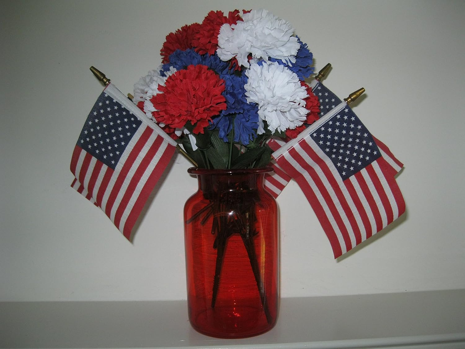 PATRIOTIC ARRANGEMENT 16 INCHES HIGH WITH FOUR NEW FLAGS & A BIG BUNCH OF NEW FLOWERS VASE VINTAGE FROM THE 60'S IS 8 FOUR AMERICAN FLAGS MADE IN THE U.S.A. EACH 10 1/2 A PATRIOTIC AND HIGH QUALITY CENTERPIECE RED WHITE & BLUE FLOWERS ARE 2 BUNCHES OF ARTIFICIAL MUMS: 18 FLOWERS TOTAL