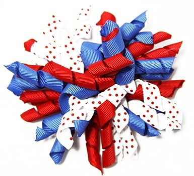 100% cotton Imported Curly Ribbon Korker Hair Clip Comes on Partially Lined Alligator Clip 4" Across Multi Color Red, Royal Blue & White with Blue Dots