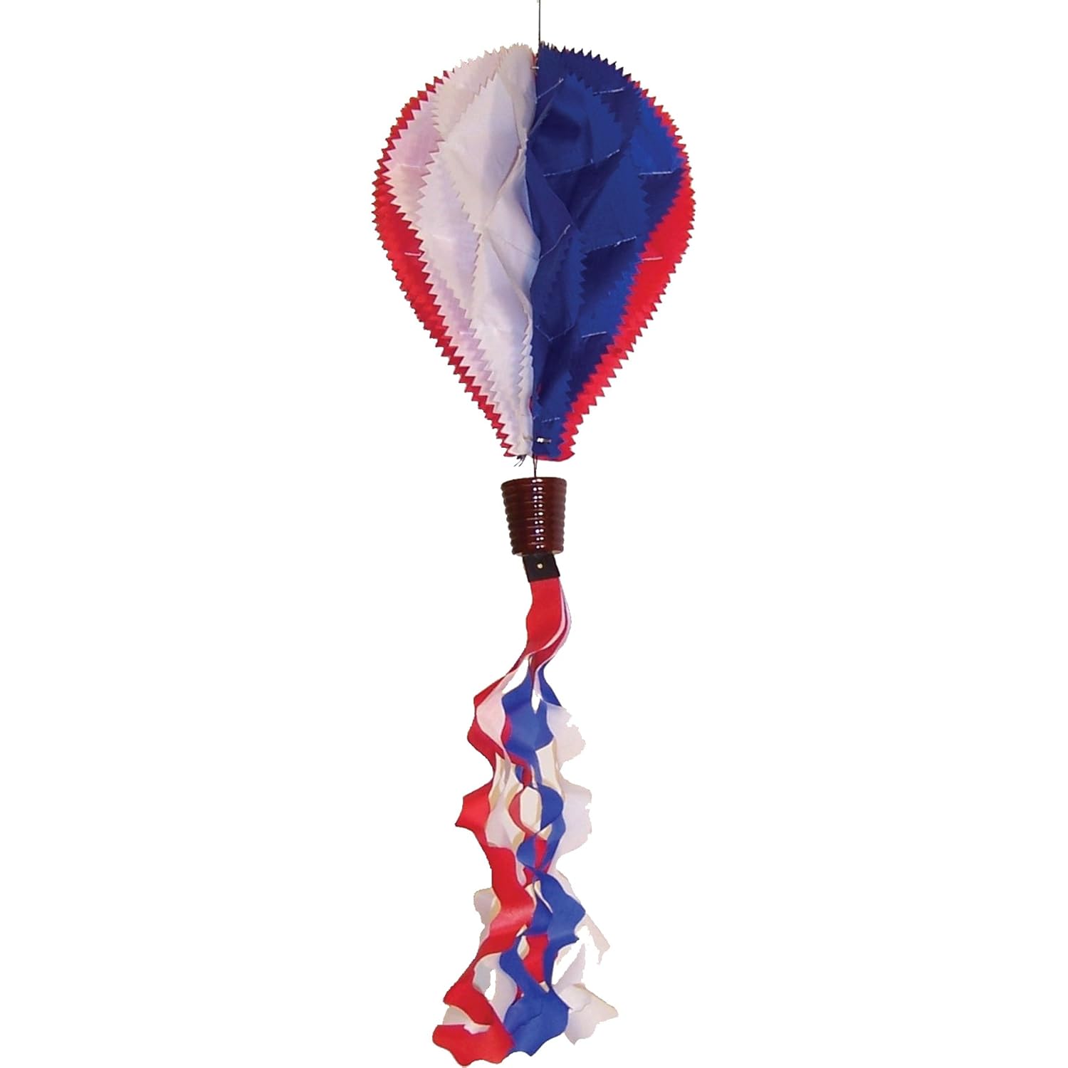 This festive Patriotic Party Balloon features bright red, white and blue colors and a honeycomb construction. The balloon shape and the curly streamer tails are both designed to catch the breeze and will add a splash of color to any outdoor space!. Made from brightly colored weather and fade resistant rip stop fabric Zigzag finished edge to minimize fraying 16" curlie streamer tails Ships flat - easy to assemble Comes with an attached heavy duty snap swivel for easy hanging