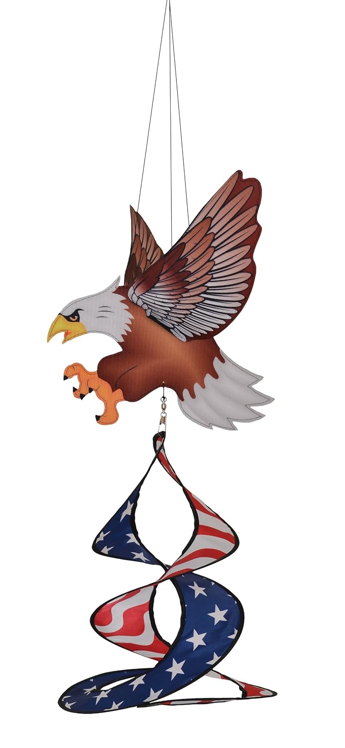 Weather and fade resistant rip stop polyester fabric laminated on plastic to maintain eagle's shape Detailed dye-sublimated printed graphics Red, white and blue curlie hangs below eagle No assembly required Attached heavy duty snap swivel for easy hanging