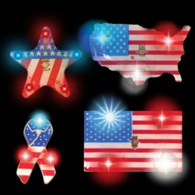 Add an extra element of fun to patriotic events with our Patriotic Assortment LED Blinkies A great way to get in the patriotic spirit for Fourth of July and Memorial Day events, elections, and other special occasions, these light up patriotic blinkies will make a statement wherever you go. Pass these light up patriotic blinkies out as party favors, wear them to the local fireworks display, or incorporate them into your party decor, the possibilities are practically endless This assortment of light up patriotic blinkies features blinkies in the shape of a star, a flag, a ribbon, and the USA. Each light up patriotic blinky has 5 LEDs-3 red, 2 blue-that flash on and off, as well as a butterfly pin connector. Please note, the butterfly connector may leave a small hole in the garment you attach it to. Our light up patriotic blinkies come with two CR927 batteries that are included, installed, and replaceable. The Patriotic Assortment LED Blinkies are sold in increments of 12 and come individually packaged in a clam shell.