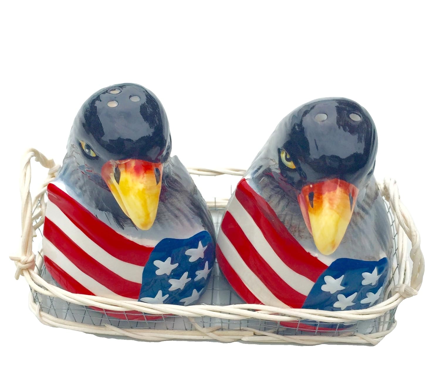 Americana Style Patriotic Eagle USA Flag Ceramic Salt and Pepper Shaker Three Piece incl.: Basket Holder and Two Salt and Pepper Shaker Included: White Basket Holder with Metal Wire Design Rubber Stoppers on the Bottom Measures appox: 3 1/2" X 2 1/2"
