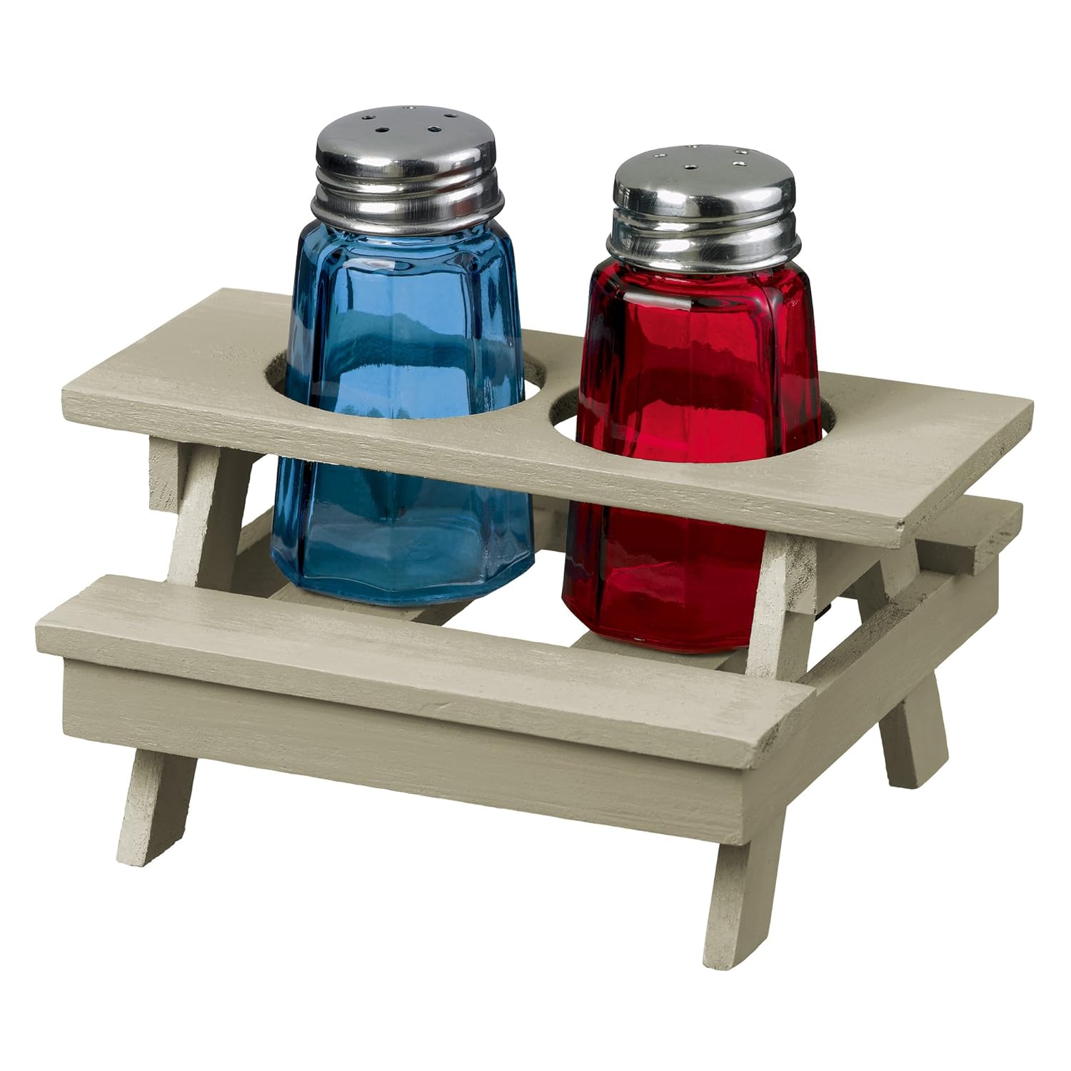 Grasslands Road Backyard BBQ Red and Blue Glass Salt and Pepper Shaker Set in Retro White Picnic Table