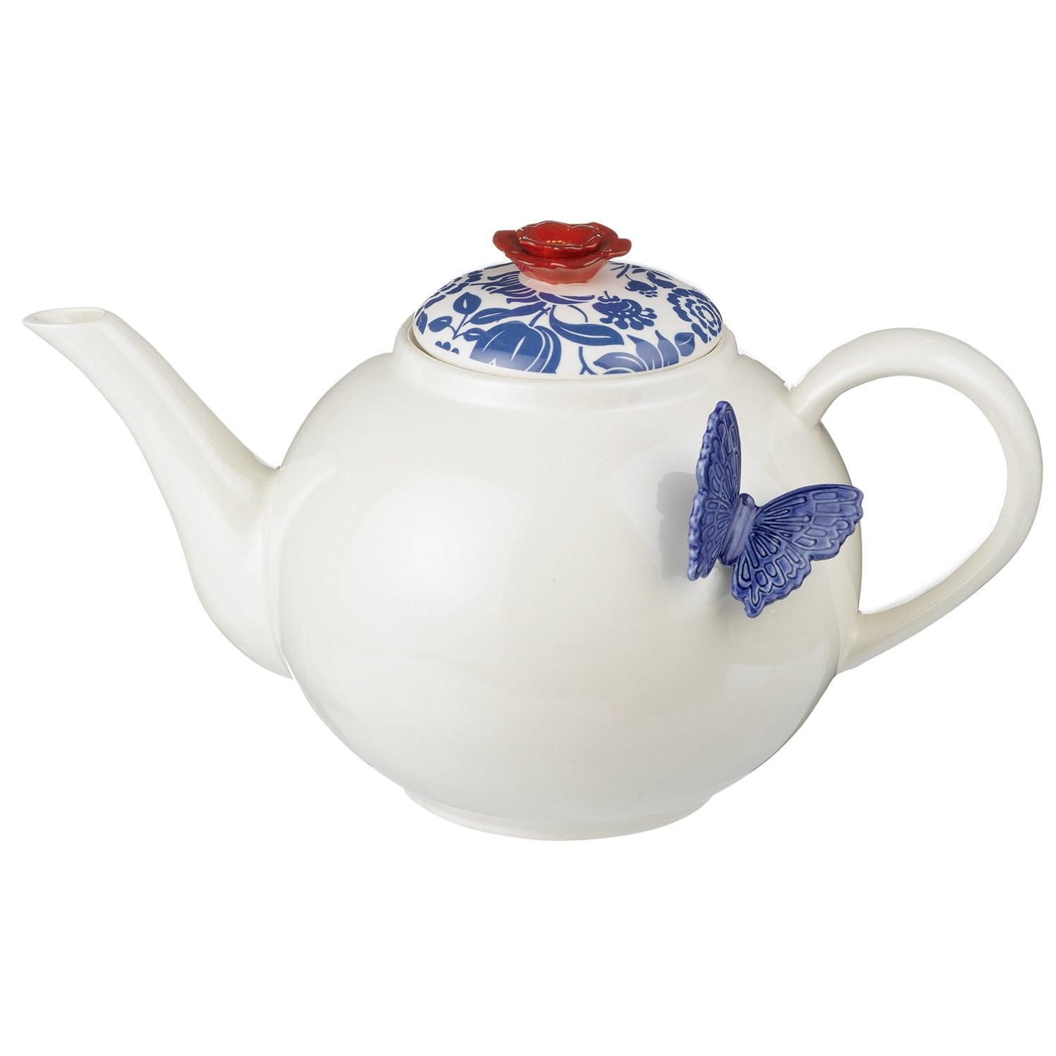 High gloss ceramic pot with sculpted butterfly attachment on side and sculpted flower on lid Teapot measures 9 7/8 Inch long, 6 Inch tall and 5 1/4 Inch wide Hand wash and air dry Teapot is gift boxed and ready for gifting