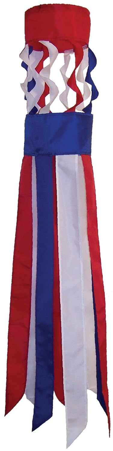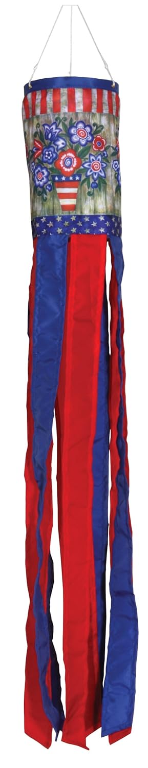Patriotic flowers windsock Beautifully detailed print designs and embroidery with matching fabric and streamers Windsock is fully hemmed; high-quality durable polyester UV resistant fabric; windsock includes snap hook and swivel Weather and fade Resistant Licensed Art; 6-inches by 42-inches