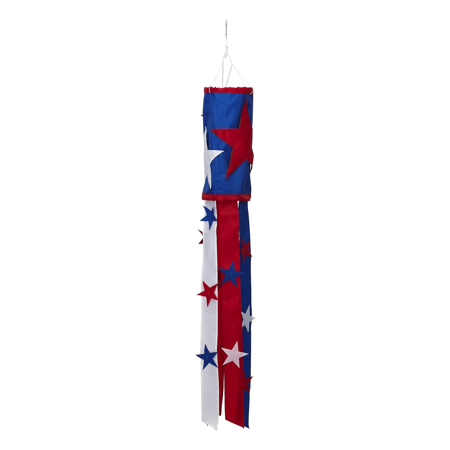 Star windsock is handcrafted from 100% nylon flag fabric. White star is sewing machine appliqued, with high quality thread, on a royal blue background. Top and bottom borders are white. Streamers are red and white. Tubing keeps the windsock round. This windsock measures approximately 46" long and 9" wide. Add an additional 15" for cord and ring. Since windsocks are individually made, no two are exactly alike