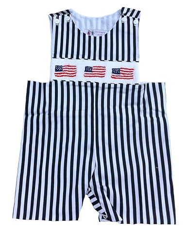 Boys blue and red striped white short overalls Featuring American flags smocked across the bodice Perfect for a Fourth of July celebration, summer barbecue, or weekend at the shore Buttons at shoulder and snaps at the bottom for easy dressing 45% Polyester / 55% Cotton; Machine Washable