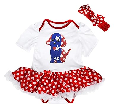 Newborn - 18 Months 4th July Patriotic Star Dog Puppy White Bodysuit Girls Baby Dot Dress