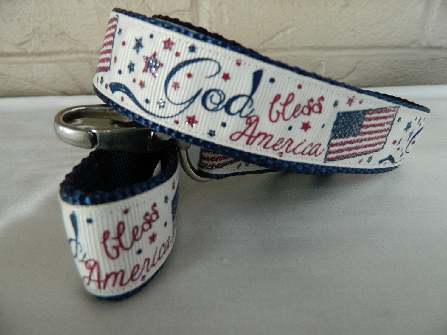 This patriotic American flag dog leash is great for the summer! This is a handmade dog leash. It is made of 100% cotton with an interfacing core for strength. The length is approximately five and a half feet and has a durable snap hook. The leash is available in two widths: 1 inch width, that coordinates with my medium and large collars, or 3/4 inch width, that coordinates with my small and extra small collars.