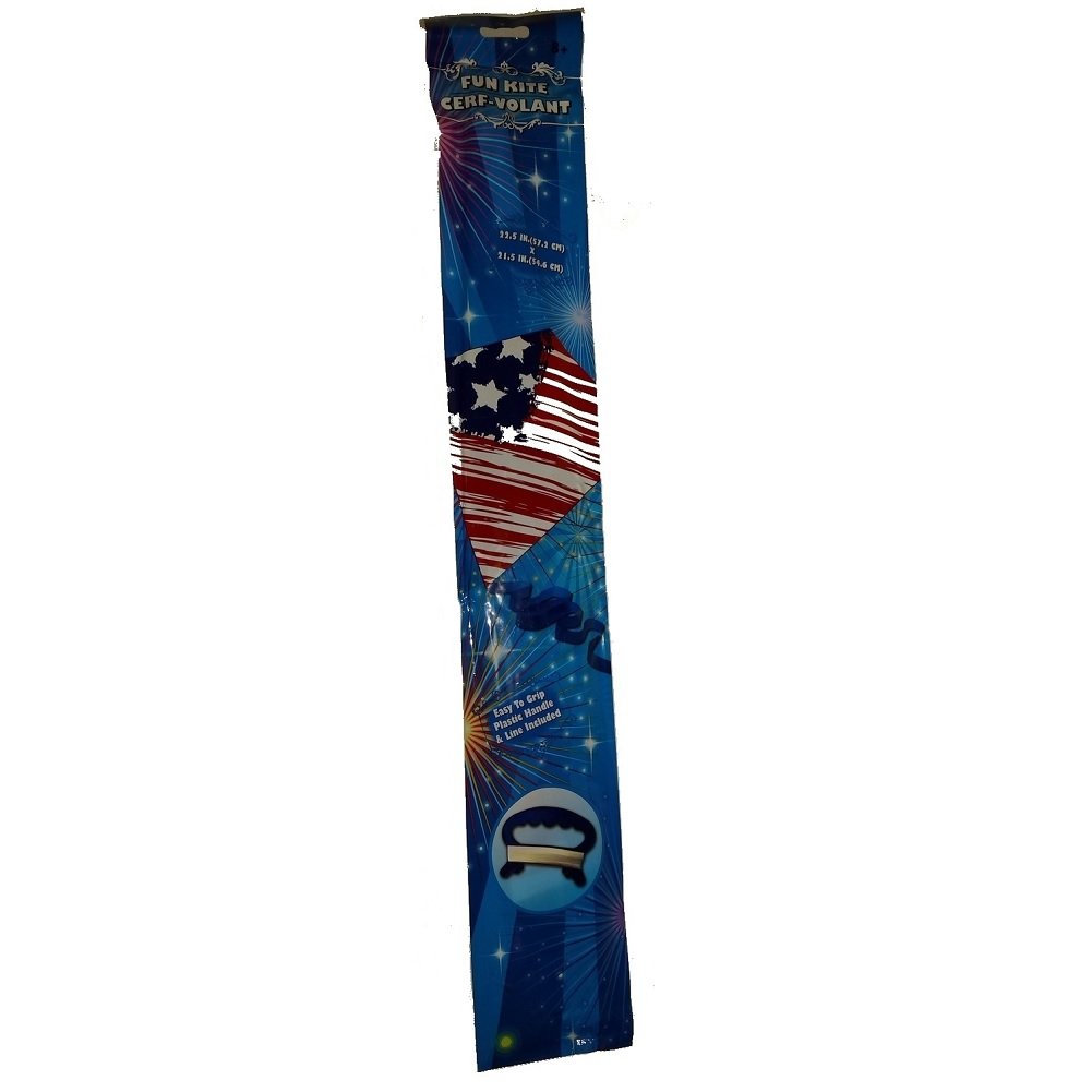 Made with weather resistant rip stop polyester fabric and fiberglass rods 30-inch long by 19-inch wide - with (3) 12-feet tails Printed stars and applique design Kite bag with velcro closure - 50lb by 300-feet braided polyester kite line on hoop Easy to fly in winds ranging from 8~25 mph