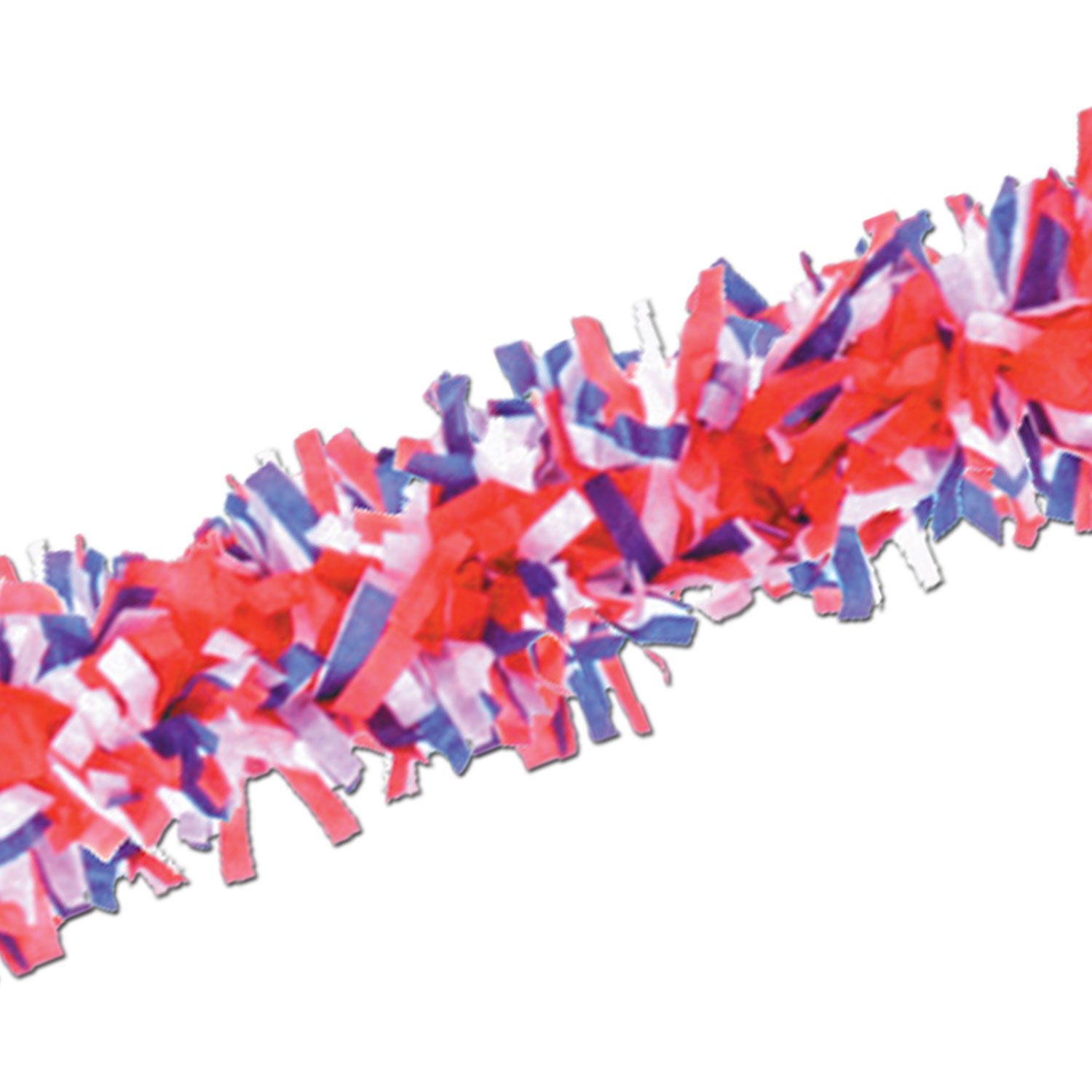 Multi Color Paper Tissue Garland - Red, White and Blue An easy addition to your party decor, just unroll and pin everywhere. Easy to cut, it doesn't fray. • 25 feet long and 3 inches wide • paper tissue with clear cellophane fringe for extra luster