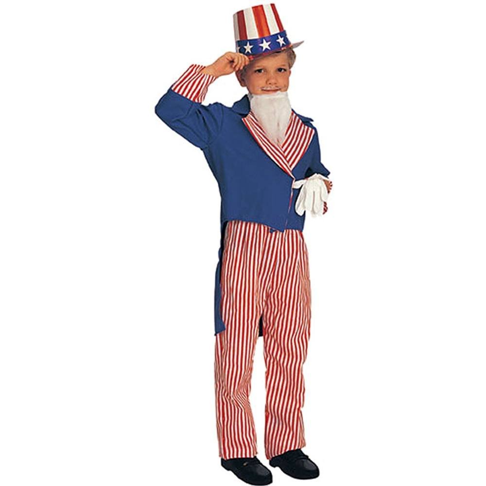 Child Unclude Sam Costume includes Jacket with Tails, Pants & Shirt Front (Hat, Beard & Gloves not included) Red, White and Blue Per Mftr. Small (Child 4-6 for 3-4 years), Medium (Child 8-10 for 5-7 years) and Large (Child 12-14 for 8-10 yrs)